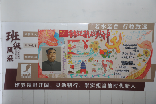 初二年級作為承上啟下的關(guān)鍵時期,以“砥礪前行,綻放光彩”和“弘揚偉大抗戰(zhàn)精神,做光榮自豪中國人”為主題,展現(xiàn)了學(xué)子們的堅毅與擔(dān)當(dāng)。各班文化墻或以時間軸呈現(xiàn)奮斗歷程,或用歷史圖片、英雄事跡重溫崢嶸歲月,將個人成長與家國情懷緊密相連,激勵著同學(xué)們在學(xué)習(xí)的道路上不畏艱難,勇往直前。