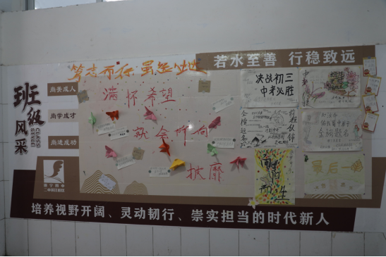 初三年級的主題則聚焦當(dāng)下與未來,“沖刺中考,夢想飛揚”與“迎國慶,頌祖國”相得益彰。面對中考的挑戰(zhàn),班級墻上醒目的中考倒計時、目標(biāo)高中、勵志標(biāo)語,營造出緊張而有序的備考氛圍。同時,同學(xué)們將對祖國的熱愛融入設(shè)計,用鮮艷的色彩和真摯的文字,表達(dá)了將個人夢想融入民族復(fù)興偉業(yè)的堅定決心。