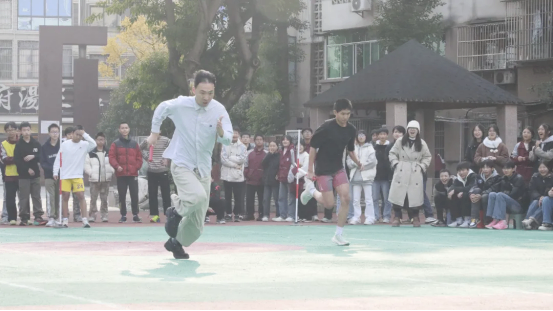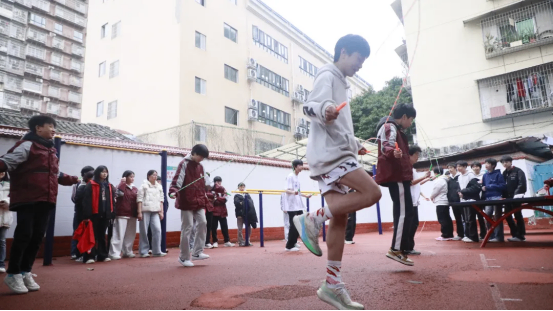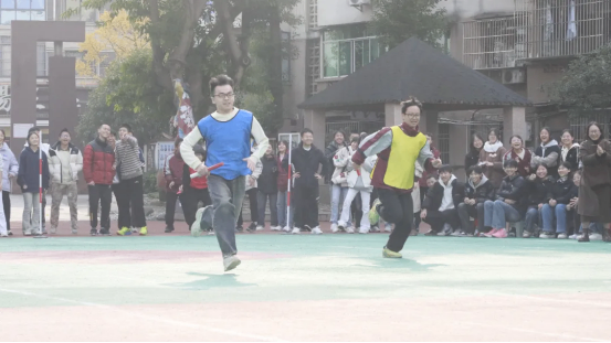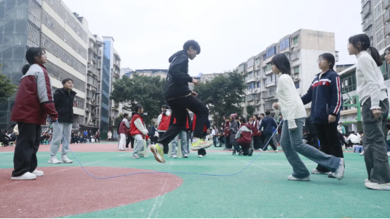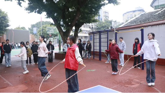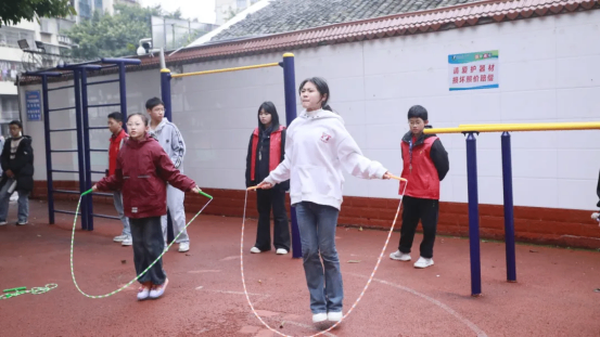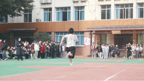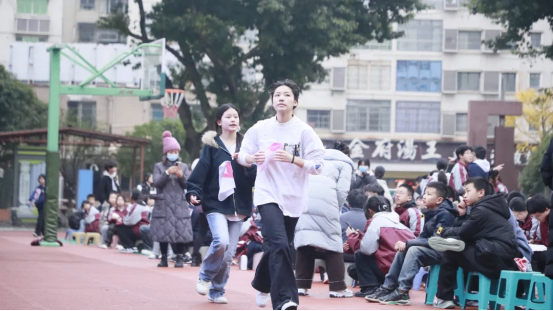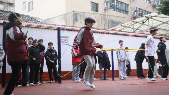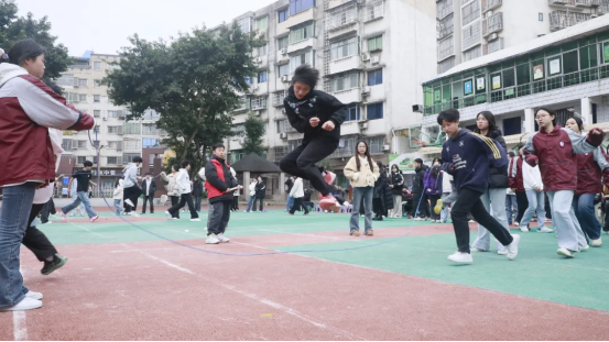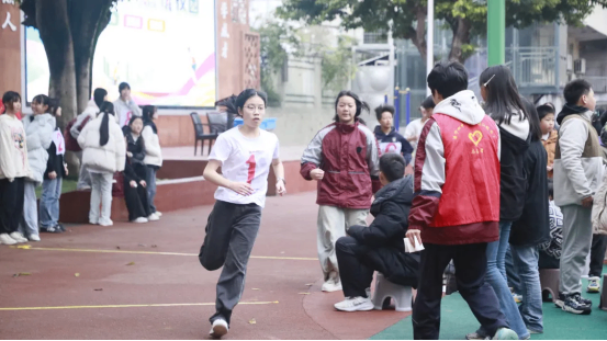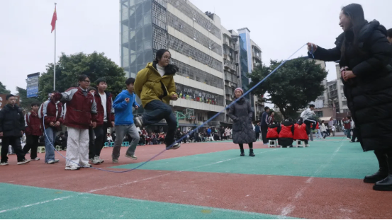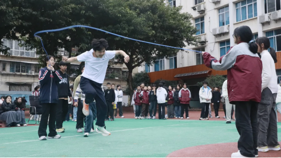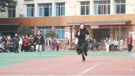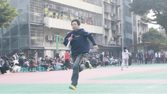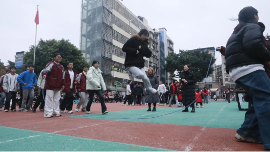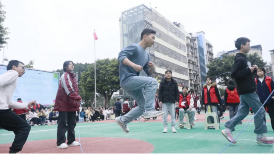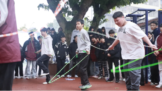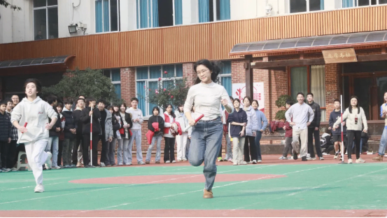 最富趣味性的三分鐘8字跳繩項(xiàng)目,每班跳繩隊(duì)員與搖繩隊(duì)員配合無間,師生同樂,長繩飛舞,人影穿梭,構(gòu)成了一幅和諧而充滿活力的動(dòng)人畫卷。