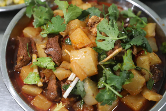 主打硬菜紅燒羊肉,肉質(zhì)軟爛不膻,醬汁香濃入味,一口暖透四肢;搭配白蘿卜羊雜湯,清潤滋補(bǔ),羊雜鮮香與蘿卜清甜碰撞,驅(qū)寒又潤燥。還有青筍木耳炒肉脆嫩爽口,紅燒茄子軟糯下飯,尖椒玉米粒鮮香微辣,葷素搭配營養(yǎng)拉滿,每一口都是舌尖小確幸。
