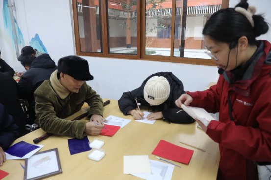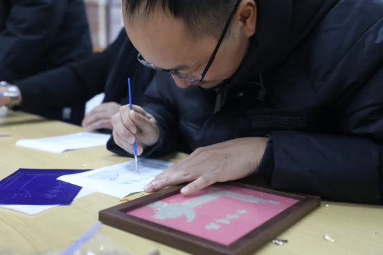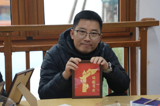 儀式結(jié)束后,隊(duì)伍轉(zhuǎn)赴遂寧市青少年綜合實(shí)踐基地。在“愛國(guó)主題燒箔畫”手工體驗(yàn)課中,教師們化身“工匠”,細(xì)心勾勒、精心貼箔、巧妙灼刻,黨徽、國(guó)旗、長(zhǎng)征路線圖等紅色元素漸漸在板上熠熠生輝。
