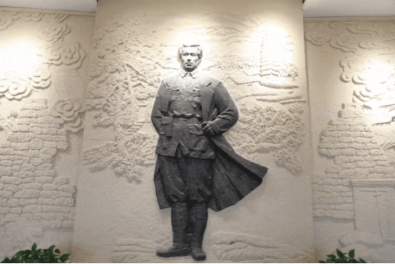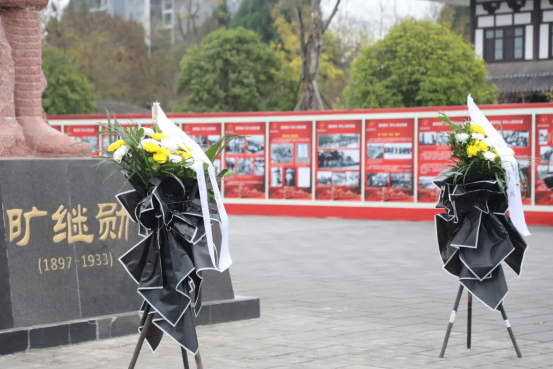 校領(lǐng)導(dǎo)緩步上前,向曠繼勛烈士塑像敬獻(xiàn)花籃。